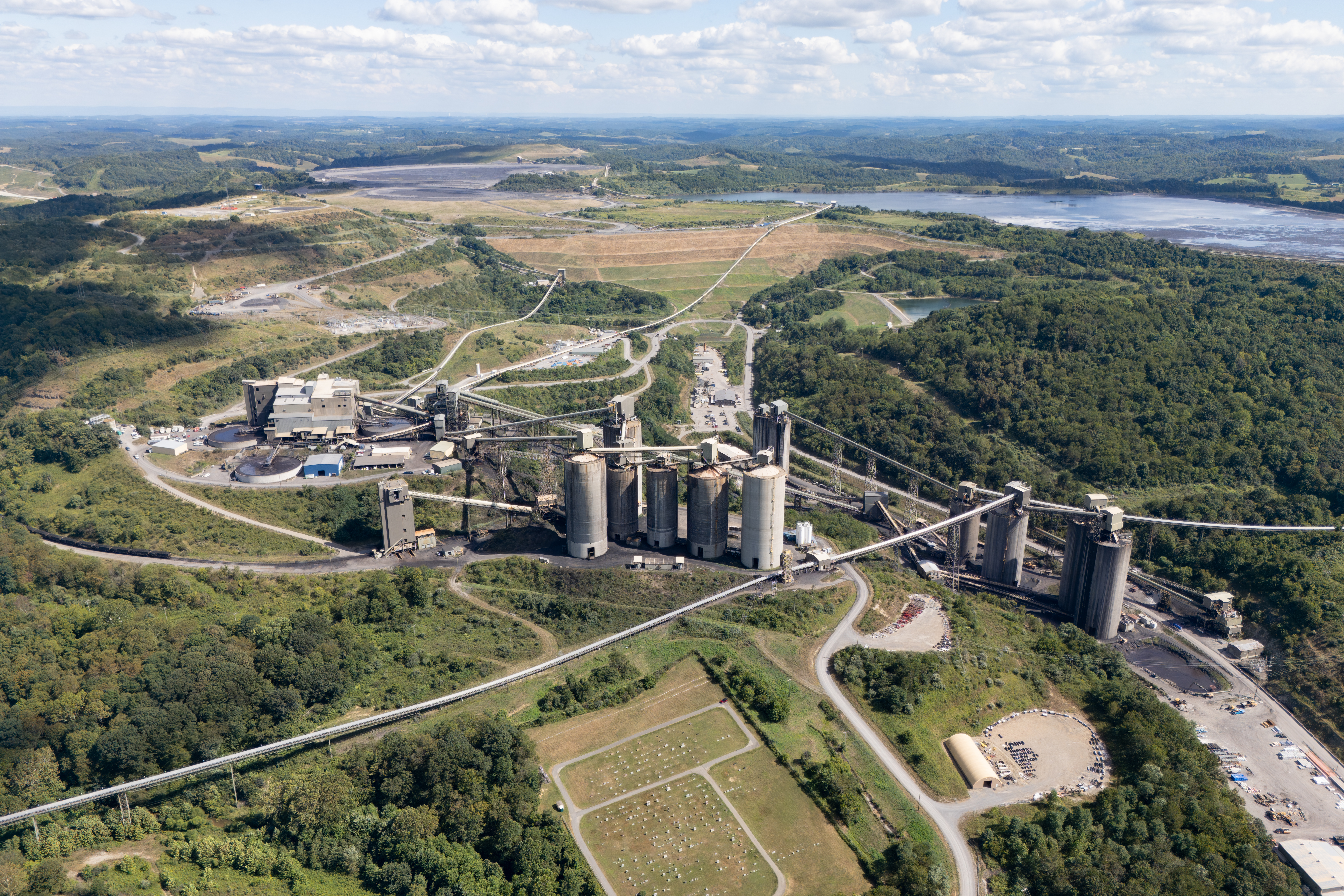 The environmental footprint of coal mining is immediately visible in this photograph of the processing plant of the Pennsylvania Mining Complex (PAMC). Nearly a dozen enormous coal silos loom over a small cemetery and the surrounding forest. Conveyor belts stretch out across hills and valleys for miles in every direction. On the left, three large circular tanks are used to wash raw coal before it is loaded onto train cars and shipped to market. And in the back of the image, a huge Coal Refuse Disposal Area shimmers like a lake, filled with a toxic slurry of coal waste.
