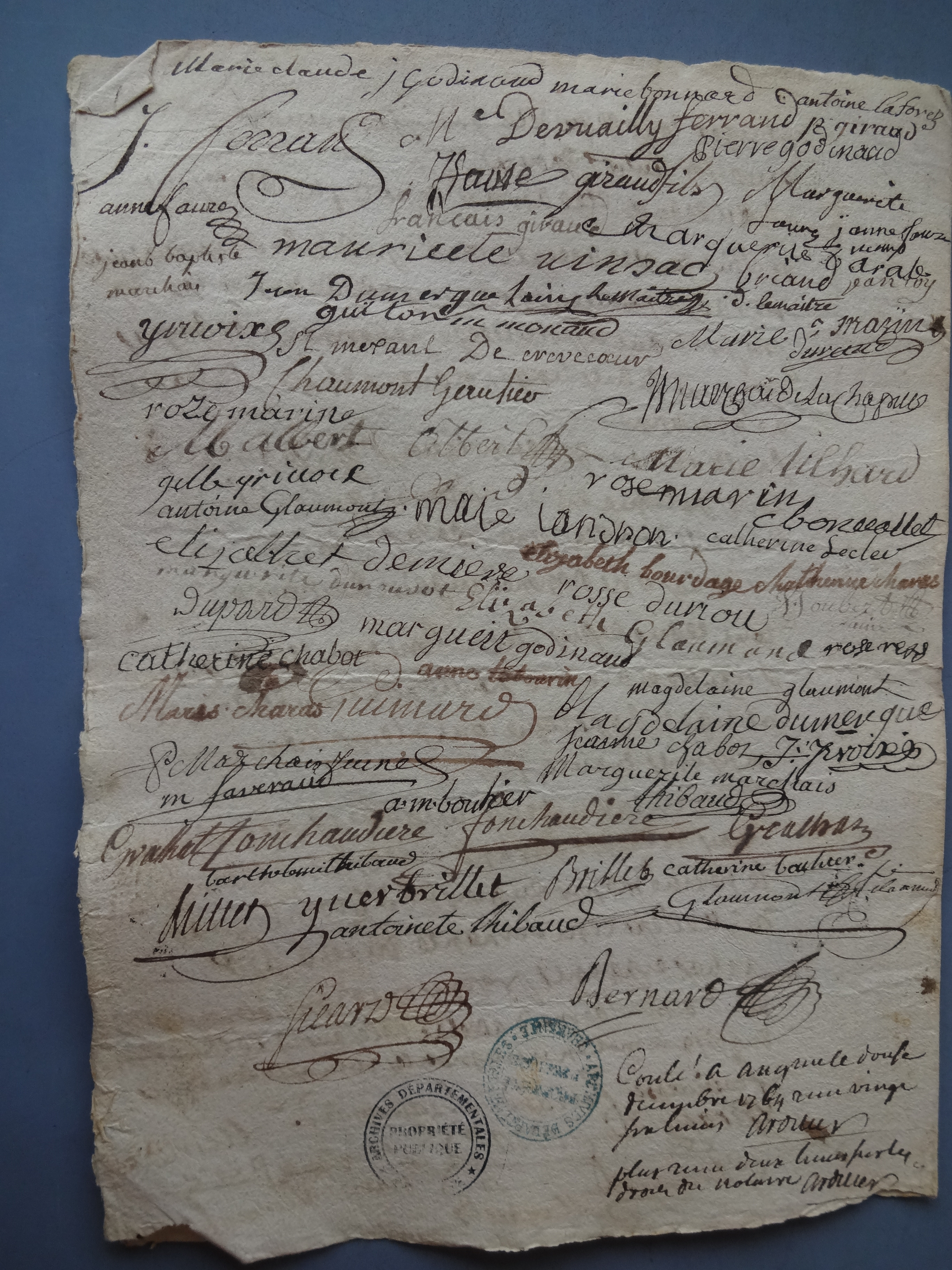 On December 9, 1764, Françoise Ferrand, the daughter of a joiner in Angoulême, and Étienne Allemand, the son of a tailor, signed an unusual pre-nuptial contract. They commit all their goods and rights, present and future, including any goods that might come to Françoise from the estate of her late father, who had died in Martinique, "in whatever they might consist, and in whatever place they might be found." The most unusual part of the record is the conclusion. The contract was signed by "the parties and their relatives who were present" and the signatures extend over two pages: the contract was signed by eighty-three people.