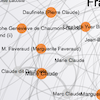 The signatures on the contract, which is in the notarial records in the Archives départementales de la Charente, are shown in the images to the right. "Contract Signatories" and "Overseas Connections," above, are visualizations of the social relationships of the eighty-three individuals, together with other individuals who constituted their social networks in the town. These "other individuals" have at least one of the following relationships to a signatory of the marriage contract: parent, child, sibling, spouse, or "godparent-relation" (godparent of, godchild of, godparent to the child of, co-godparent with.) The figure labeled "Contract Signatories" shows the signatories, together with 221 of their relatives and friends.