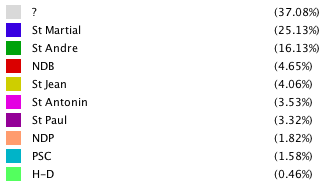 In this graph, the nodes representing the 2411 people in Angoulême have been sized so as to highlight differences in connectedness. Here, the most connected individuals (with 18 connections) appear with a diameter 15 times larger than that of the least connected. Unsurprisingly, the gray nodes, those that represent people of indeterminate parish, are generally small as are people from outside Angoulême. The one larger black node at the bottom represents Suzanne Roubier who was from outside St Martial and who married Barthelemi Dars of St Martial in 1764. Overall, the average number of connections each person has is 2.547. Some parishes, perhaps most notably Notre Dame de Beaulieu display a high concentration of connected people, while others like St Antonin, are both scattered and of more uniformly moderate size.