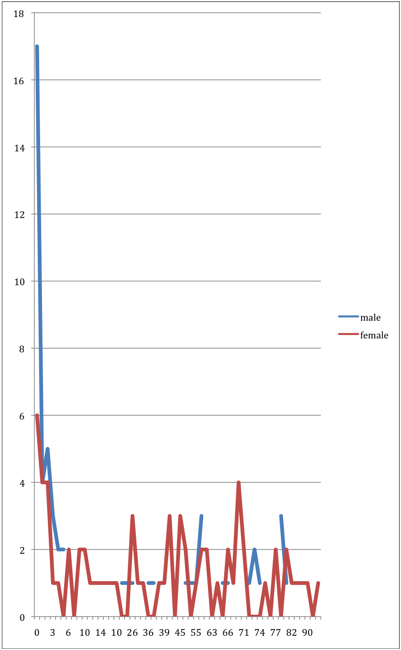 The nodes corresponding to the 152 people who died have been sized according to their age at death and colored according to their gender. Of that number, 22 were of unspecified age. Of the 130 remaining, it is easy to see that the data is split between people who were very young and those of more advanced age. 31 of the people who died were less than two years old. 54 were 10 or younger. About equal numbers of men and women died, but comparatively far more women survived childhood.