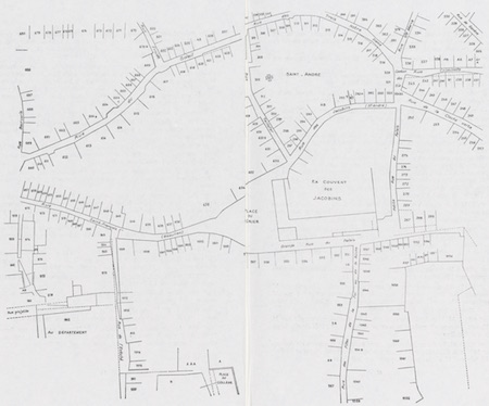 The house numbers in the tax register of 1791 correspond to a remarkable map of the entire central part of the town, the “Plan Directeur” of 1792, showing the names of all the streets and the numbers of all the houses, which now hangs on the wall of the entry to the Archives Municipales d’Angoulême. This is the portion of the map which shows the houses in the former Isle de la Cloche Verte. The drawing of the map was prepared by Henri Baranger, in James Forgeaud, « La Place du Murier et ses environs, » Bulletins et mémoires de la société archéologique et historique de la Charente BSAHC (1987), 37-70.